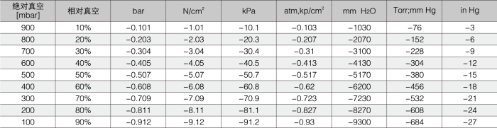 下面列出的表是绝对真空值和相对真空值的比较